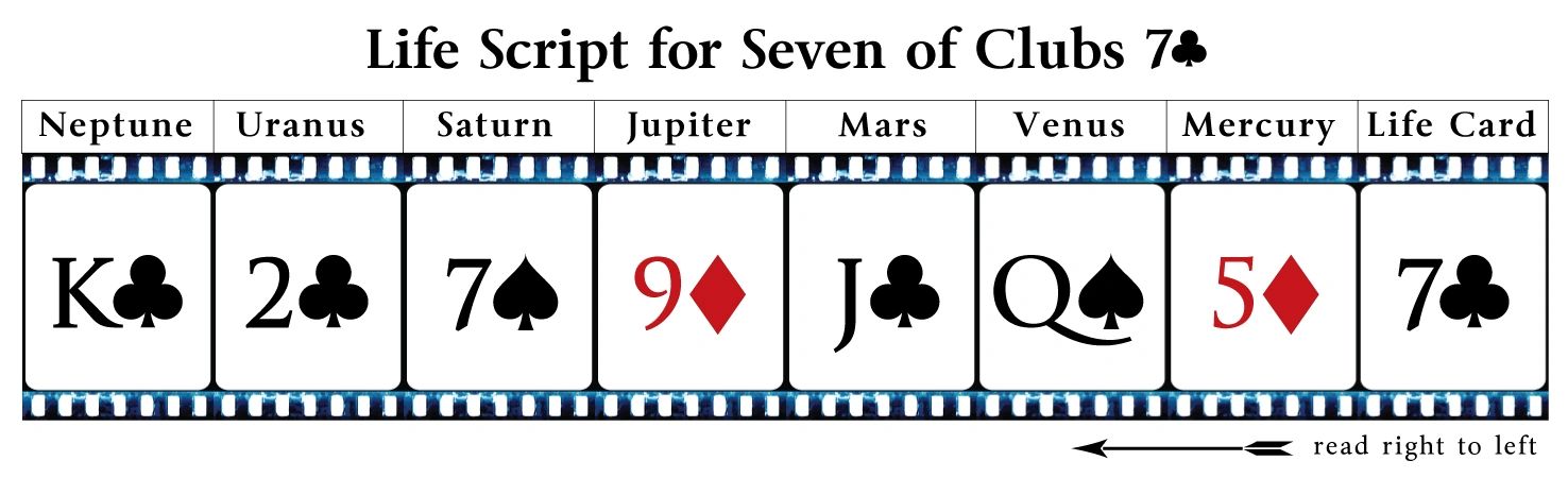 With two Kings in their life’s script, the King of Hearts♥ in Uranus and the King of Diamonds♦ in Neptune, there is ample energy to succeed in a big way, to amass great wealth and finally experience the freedom in life that is justly deserved. The Seven of Diamonds♦ life script is also written with two Nines, the Nine of Clubs♣ in Mars and the Nine of Spades♠ in Jupiter. These bring the choice to focus on the negative. Feast or famine? Which one they experience depends on the Seven of Diamonds♦ perspective.