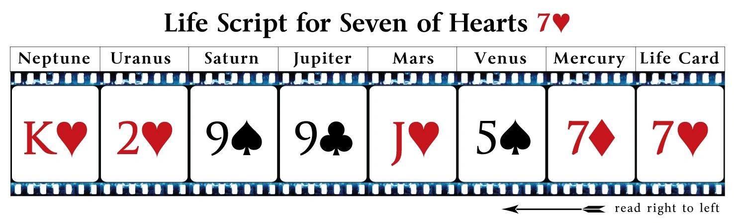 With the Jack of Hearts♥ in the Venus position in their life script, there is a responsibility to those they love, perhaps family, children or community, resulting in an instinctual self-sacrificing on their behalf. This Jack of Hearts♥ influence also gives the Seven of Diamonds♦ person a youthful exuberance that remains throughout their lives. Finding a balance between work/responsibility and restorative recreation/pleasure can be a life theme for Seven of Diamonds♦ people.