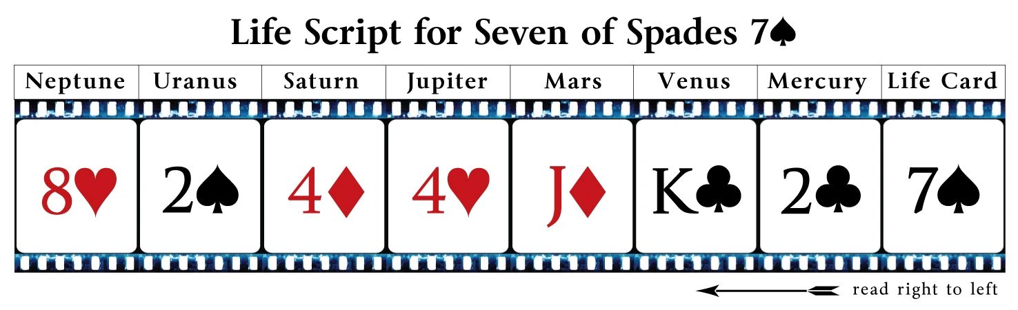As one of the most spiritual cards in the deck, the Seven of Spades♠ is here to learn faith and trust, particularly in the areas of their health and their work. Their Jupiter/Neptune position in the Master Heaven Script indicates the need to focus on higher values in order to receive the blessings available to them. Once faith, trust and truthfulness are truly embraced and lived fully, their wishes seemingly come true. Life’s reality, however, is destined to challenge their high ideals from time to time to test their inherent faith, trust, and the need to speak their truth.