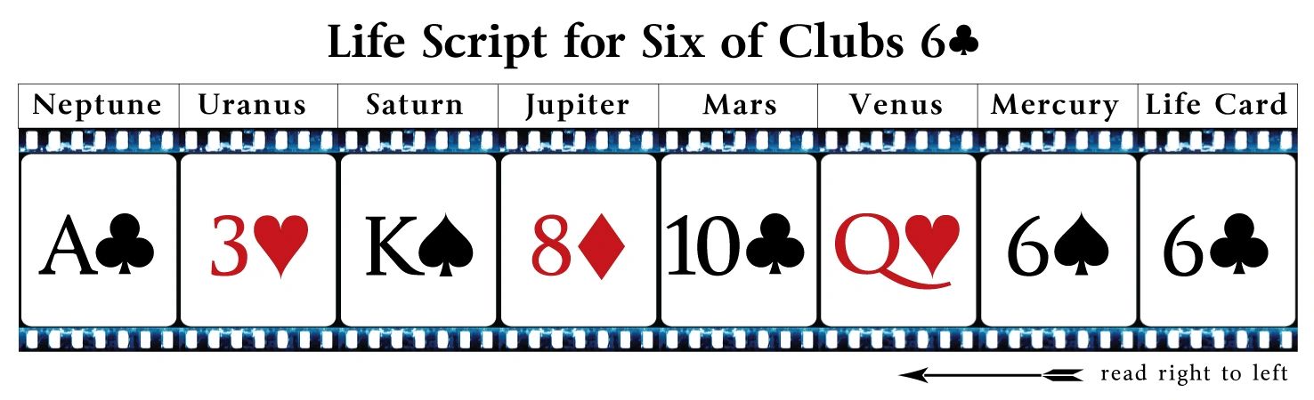 Because of the Six of Clubs♣ placement (Neptune/Saturn) in the Master Earth Script, it is highly recommended that people with this card avoid the use of alcohol and drugs and be cautious with any addictive or mind-altering substances, including prescriptions.