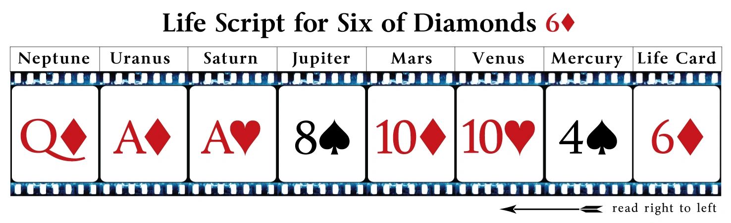 A remarkable trio of cards blesses the Six of Spades♠. Their Ten of Clubs♣ card in Venus in their life script blesses them with a powerful intelligence to do the things they love to do, as well as attract other knowledgeable people. Their Eight of Diamonds♦ card in Mars motivates them to achieve their financial goals. Again, the cause-and-effect nature of a Six pays off royally if they put forth the effort. The King of Spades♠ sits prominently in the Jupiter position, suggesting remarkable success in life through responsibility, self-discipline, integrity, and hard work.
