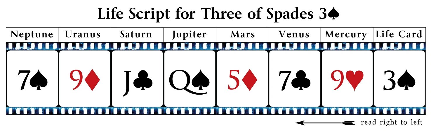 There is a tendency to want to escape the responsibilities of life as expressed through their Jack of Clubs♣ in Saturn in their life script. Jack energy is wily and crafty, youthful and irresponsible when expressed in its lower nature. As a result, a longing for the good life may be underlying the Queen of Spades♠ energy of putting in a good day’s work. The higher expression of this Jack energy, however, is a sharp intellect and tremendous creativity. Putting those into service of creative expression and career achievements suggests that the Three of Spades♠ person has all the tools they need to accomplish their goals.