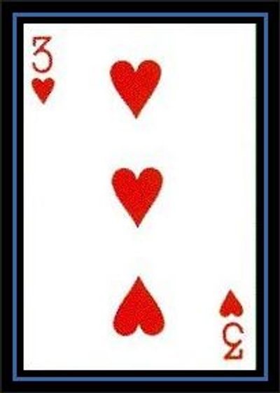 The Three of Hearts♥ love to keep their options open. Whether it is professional expression or personal exploration, the Threes (3) of the deck have a hard time focusing, choosing and committing to their choice. Highly creative, as all Threes are, the Three of Hearts♥ is forever curious about life and love and gives ample time and energy to exploring all possibilities. They need variety and travel in their profession to feed their insatiable craving for new and different experiences.